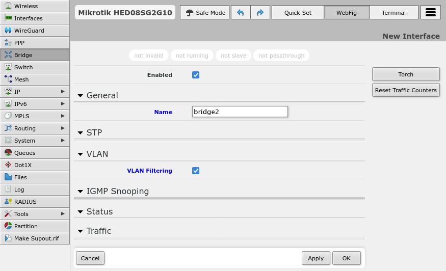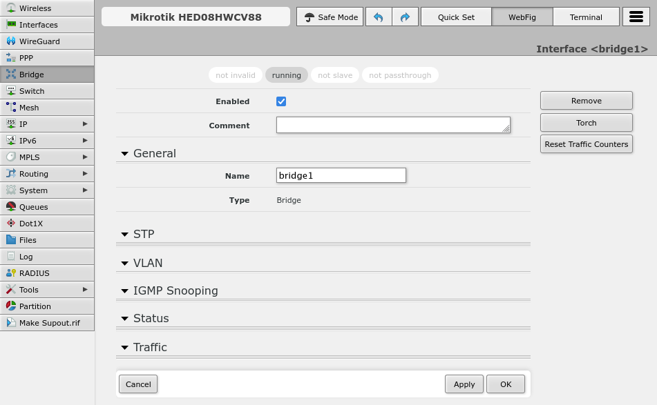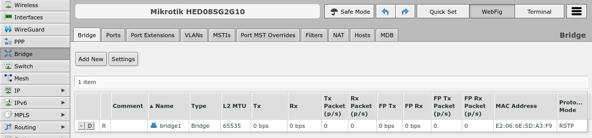 [admin@Mikrotik] > /interface/bridge add name=bridge1 [admin@Mikrotik] > /interface/bridge/port add bridge=bridge1 interface=ether3 [admin@Mikrotik] > /interface/bridge/port add bridge=bridge1 interface=ether4 [admin@Mikrotik] > /interface/bridge/port add bridge=bridge1 interface=wifi1 [admin@Mikrotik] > /interface/bridge print Flags: X - disabled, R - running 0 R name="bridge1" mtu=auto actual-mtu=1500 l2mtu=1568 arp=enabled arp-timeout=auto mac-address=48:A9:8A:B8:DA:7F protocol-mode=rstp fast-forward=yes igmp-snooping=no auto-mac=yes ageing-time=5m priority=0x8000 max-message-age=20s forward-delay=15s transmit-hold-count=6 vlan-filtering=no dhcp-snooping=no [admin@Mikrotik] > /interface/bridge/port print Flags: I - INACTIVE Columns: INTERFACE, BRIDGE, HW, PVID, PRIORITY, PATH-COST, INTERNAL-PATH-COST, HORIZON # INTERFACE BRIDGE HW PVID PRIORITY PATH-COST INTERNAL-PATH-COST HORIZON 0 I ether3 bridge1 yes 1 0x80 10 10 none 1 I ether4 bridge1 yes 1 0x80 10 10 none 2 wifi1 bridge1 1 0x80 10 10 none [admin@Mikrotik] > /interface print Flags: X, R - RUNNING; S - SLAVE Columns: NAME, TYPE, ACTUAL-MTU, L2MTU, MAX-L2MTU, MAC-ADDRESS # NAME TYPE ACTUAL-MTU L2MTU MAX-L2MTU MAC-ADDRESS 0 R ether1 ether 1500 1568 9214 48:A9:8A:B8:DA:7D 1 ether2 ether 1500 1568 9214 48:A9:8A:B8:DA:7E 2 S ether3 ether 1500 1568 9214 48:A9:8A:B8:DA:7F 3 S ether4 ether 1500 1568 9214 48:A9:8A:B8:DA:80 4 ether5 ether 1500 1568 9214 48:A9:8A:B8:DA:81 5 R bridge1 bridge 1500 1568 48:A9:8A:B8:DA:7F 6 RS wifi1 wifi 1500 48:A9:8A:B8:DA:82 7 X wifi2 wifi 48:A9:8A:B8:DA:83