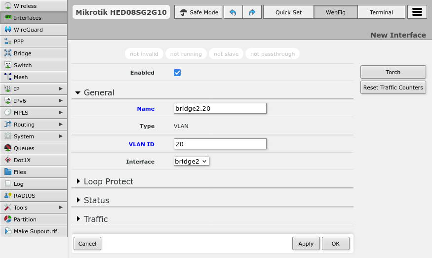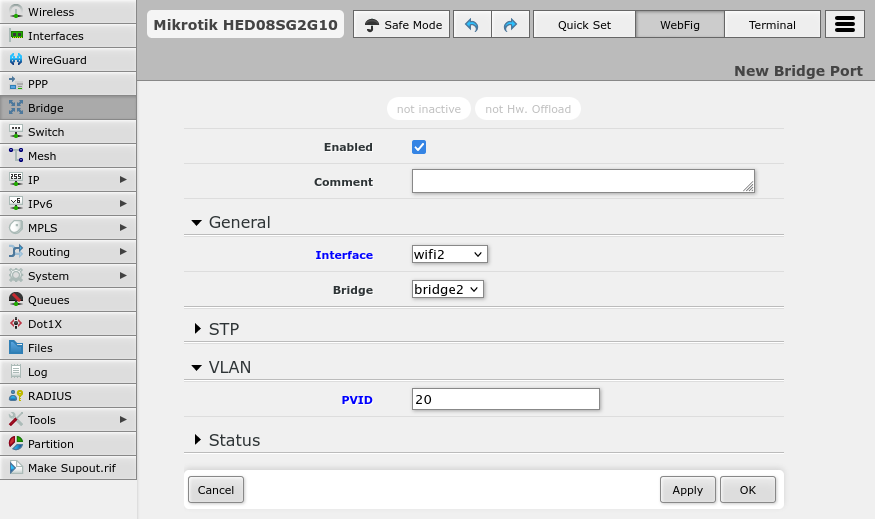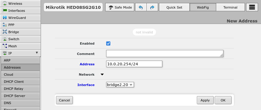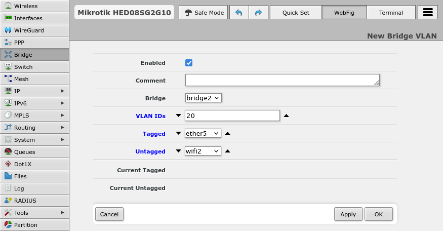 [admin@MikroTik] > /interface/bridge/vlan set 1 tagged=ether5,bridge2 [admin@MikroTik] > /interface/bridge/vlan print Flags: D - DYNAMIC Columns: BRIDGE, VLAN-IDS, CURRENT-TAGGED, CURRENT-UNTAGGED # BRIDGE VLAN-IDS CURRENT-TAGGED CURRENT-UNTAGGED 0 D bridge2 1 bridge2 ether5 1 bridge2 20 bridge2 wifi2 ether5 2 bridge2 21 ether5 wifi3 [admin@MikroTik] > /interface/vlan add interface=bridge2 name=bridge2.20 vlan-id=20 [admin@MikroTik] > /ip/addr add interface=bridge2.20 address=10.0.20.254/24 [admin@MikroTik] > /ping 10.0.20.1 count=2 Columns: SEQ, HOST, SIZE, TTL, TIME SEQ HOST SIZE TTL TIME 0 10.0.20.1 56 64 663us 1 10.0.20.1 56 64 1ms715us [admin@Mikrotik] > /interface print Flags: X, R - RUNNING; S - SLAVE Columns: NAME, TYPE, ACTUAL-MTU, L2MTU, MAX-L2MTU, MAC-ADDRESS # NAME TYPE ACTUAL-MTU L2MTU MAX-L2MTU MAC-ADDRESS 0 R ether1 ether 1500 1568 9214 48:A9:8A:B8:DA:7D 1 ether2 ether 1500 1568 9214 48:A9:8A:B8:DA:7E 2 ether3 ether 1500 1568 9214 48:A9:8A:B8:DA:7F 3 ether4 ether 1500 1568 9214 48:A9:8A:B8:DA:80 4 RS ether5 ether 1500 1568 9214 48:A9:8A:B8:DA:81 5 R bridge2 bridge 1500 1568 48:A9:8A:B8:DA:81 9 R bridge2.20 vlan 1500 65531 48:A9:8A:B8:DA:81 6 X wifi1 wifi 48:A9:8A:B8:DA:82 7 S wifi2 wifi 1500 48:A9:8A:B8:DA:83 7 RS wifi3 wifi 1500 4A:A9:8A:B8:DA:83