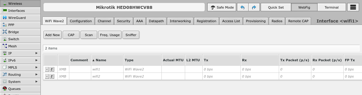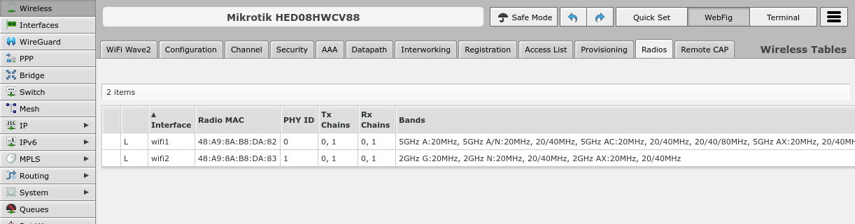 [admin@Mikrotik] > /interface/print Flags: X, R - RUNNING Columns: NAME, TYPE, ACTUAL-MTU, L2MTU, MAX-L2MTU, MAC-ADDRESS # NAME TYPE ACTUAL-MTU L2MTU MAX-L2MTU MAC-ADDRESS 0 R ether1 ether 1500 1568 9214 48:A9:8A:B8:DA:7D 1 ether2 ether 1500 1568 9214 48:A9:8A:B8:DA:7E 2 ether3 ether 1500 1568 9214 48:A9:8A:B8:DA:7F 3 ether4 ether 1500 1568 9214 48:A9:8A:B8:DA:80 4 ether5 ether 1500 1568 9214 48:A9:8A:B8:DA:81 5 X wifi1 wifi 48:A9:8A:B8:DA:82 6 X wifi2 wifi 48:A9:8A:B8:DA:83 [admin@Mikrotik] > /interface/wifiwave2 print Flags: M - MASTER; B - BOUND; X, I, R - RUNNING Columns: NAME # NAME 0 MBX wifi1 1 MBX wifi2 [admin@Mikrotik] > /interface/wifiwave2 print detail Flags: M - master; D - dynamic; B - bound; X - disabled, I - inactive, R - running 0 M BX default-name="wifi1" name="wifi1" mac-address=48:A9:8A:B8:DA:82 arp-timeout=auto radio-mac=48:A9:8A:B8:DA:82 1 M BX default-name="wifi2" name="wifi2" mac-address=48:A9:8A:B8:DA:83 arp-timeout=auto radio-mac=48:A9:8A:B8:DA:83 [admin@Mikrotik] > /interface/wifiwave2/radio print Flags: L - LOCAL Columns: RADIO-MAC, INTERFACE # RADIO-MAC INTERFACE 0 L 48:A9:8A:B8:DA:82 wifi1 1 L 48:A9:8A:B8:DA:83 wifi2 [admin@Mikrotik] > /interface/wifiwave2/radio print detail Flags: L - local 0 L radio-mac=48:A9:8A:B8:DA:82 phy-id=0 tx-chains=0,1 rx-chains=0,1 bands=5ghz-a:20mhz,5ghz-n:20mhz,20/40mhz,5ghz-ac:20mhz,20/40mhz,20/40/80mhz,5ghz-ax:20mhz,20/40mhz,20/40/80mhz ciphers=tkip,ccmp,gcmp,ccmp-256,gcmp-256,cmac,gmac,cmac-256,gmac-256 countries=all 5g-channels=5180,5200,5220,5240,5260,5280,5300,5320,5500,5520,5540,5560,5580,5600,5620,5640,5660,5680,5700,5720,5745,5765,5785,5805,5825,5845,5865,5885 max-vlans=128 max-interfaces=16 max-station-interfaces=3 max-peers=120 hw-type="QCA6018" hw-caps=sniffer interface=wifi1 1 L radio-mac=48:A9:8A:B8:DA:83 phy-id=1 tx-chains=0,1 rx-chains=0,1 bands=2ghz-g:20mhz,2ghz-n:20mhz,20/40mhz,2ghz-ax:20mhz,20/40mhz ciphers=tkip,ccmp,gcmp,ccmp-256,gcmp-256,cmac,gmac,cmac-256,gmac-256 countries=all 2g-channels=2412,2417,2422,2427,2432,2437,2442,2447,2452,2457,2462,2467,2472 max-vlans=128 max-interfaces=16 max-station-interfaces=3 max-peers=120 hw-type="QCA6018" hw-caps=sniffer interface=wifi2