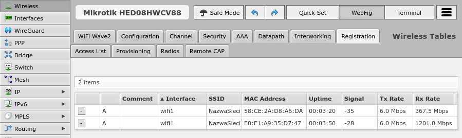 [admin@Mikrotik] > /interface/wifiwave2/registration-table print Flags: A - AUTHORIZED Columns: INTERFACE, SSID, MAC-ADDRESS, UPTIME, SIGNAL # INTERFACE SSID MAC-ADDRESS UPTIME SIGNAL 0 A wifi1 NazwaSieci E0:E1:A9:35:D7:47 1m53s -28 1 A wifi1 NazwaSieci 58:CE:2A:D8:A6:DA 1m24s -35
