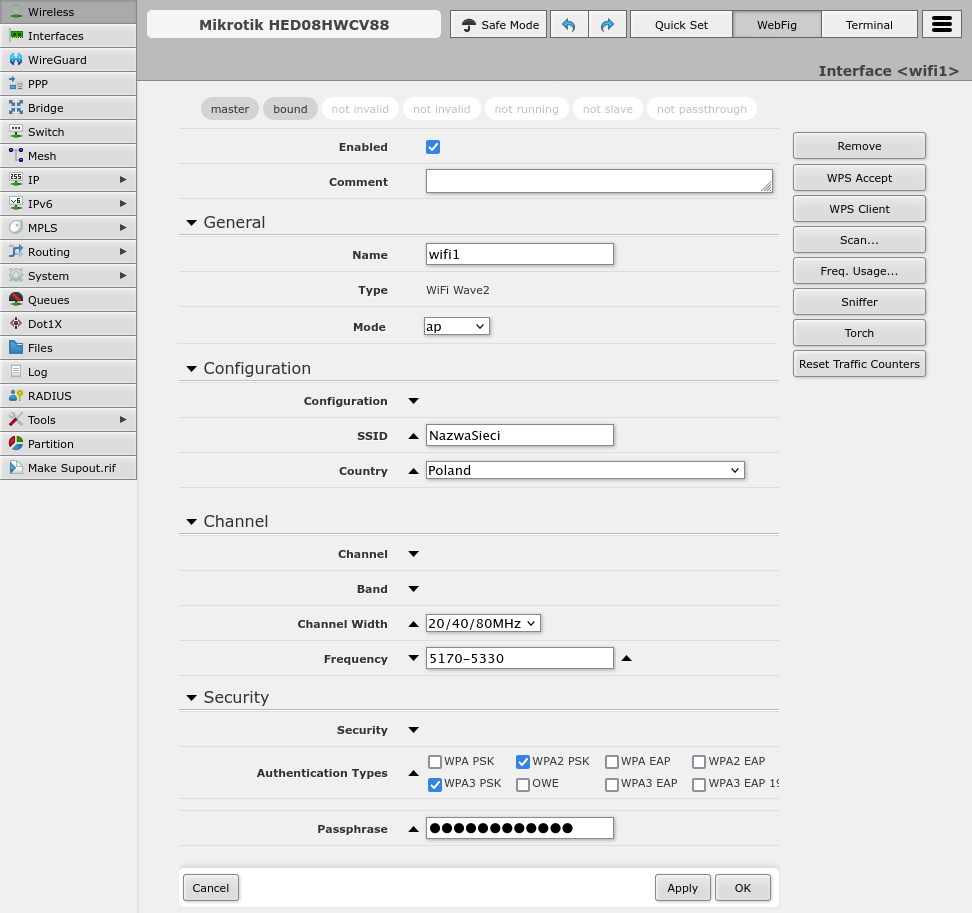 [admin@Mikrotik] > /interface/wifiwave2 set wifi1 configuration.ssid=NazwaSieci configuration.country=Poland configuration.mode=ap channel.width=20/40/80mhz channel.frequency=5170-5330 security.authentication-types=wpa2-psk,wpa3-psk security.passphrase=hasloDoSieci [admin@Mikrotik] > /interface/wifiwave2 enable wifi1 [admin@Mikrotik] > /interface/wifiwave2/actual-configuration/print detail 0 ;;; DFS channel availability check (1 min) name="wifi1" mac-address=48:A9:8A:B8:DA:82 arp-timeout=auto radio-mac=48:A9:8A:B8:DA:82 configuration.mode=ap .ssid="NazwaSieci" .country=Poland security.authentication-types=wpa2-psk,wpa3-psk .passphrase="hasloDoSieci" channel.frequency=5170-5330 .width=20/40/80mhz 1 name="wifi2" mac-address=48:A9:8A:B8:DA:83 arp-timeout=auto radio-mac=48:A9:8A:B8:DA:83 [admin@Mikrotik] > /interface/wifiwave2/actual-configuration/print detail 0 name="wifi1" mac-address=48:A9:8A:B8:DA:82 arp-timeout=auto radio-mac=48:A9:8A:B8:DA:82 configuration.mode=ap .ssid="NazwaSieci" .country=Poland security.authentication-types=wpa2-psk,wpa3-psk .passphrase="hasloDoSieci" channel.frequency=5170-5330 .width=20/40/80mhz 1 name="wifi2" mac-address=48:A9:8A:B8:DA:83 arp-timeout=auto radio-mac=48:A9:8A:B8:DA:83