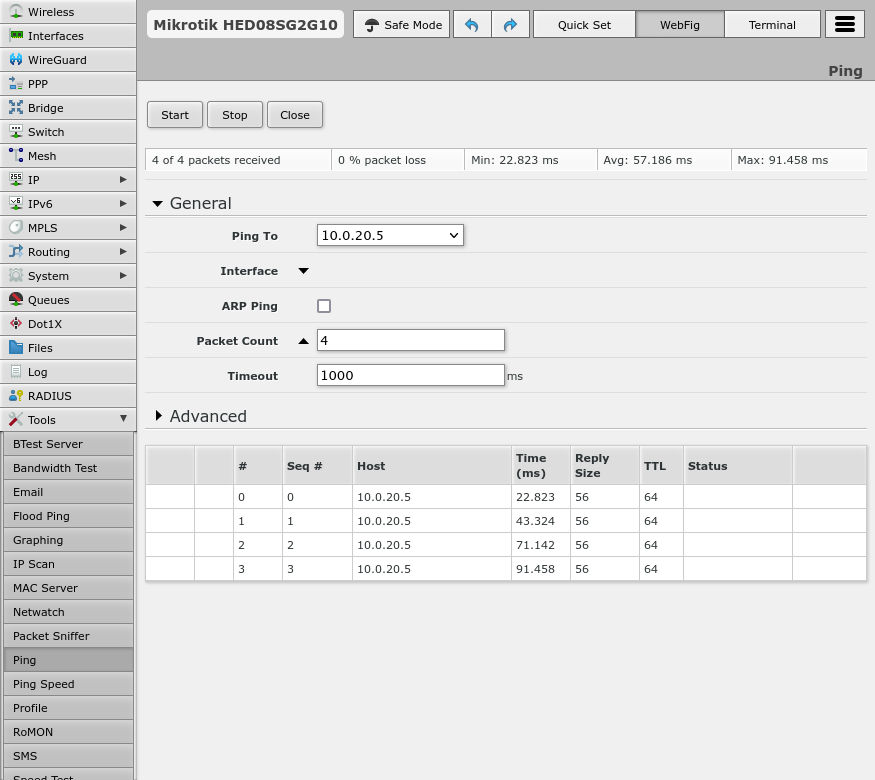 Można też wykonywać komendy z innego poziomu poprzedzając go poziomem, np. skądkolwiek można wpisać /tools/ping 1.1.1.1