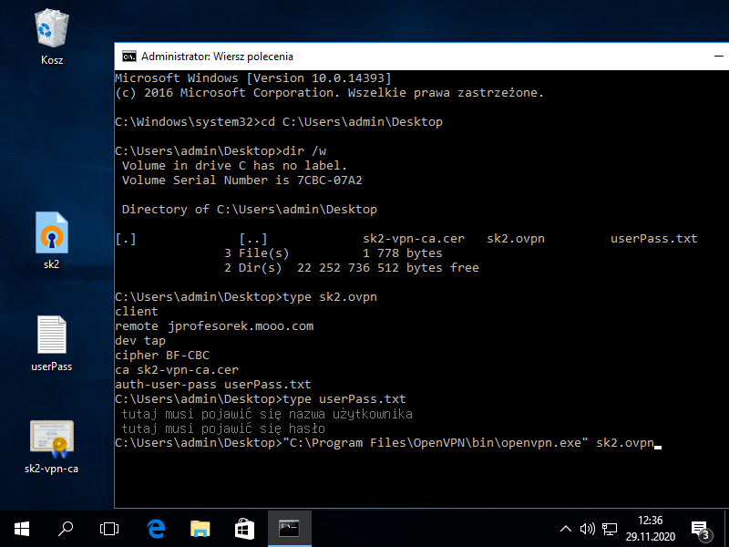Uwaga: VPN jest skonfigurowany tak, by była łączność między wszystkimi podłączonym osobami, co będzie wykorzystywane w trakcie zajęć, ale niesie za sobą dość oczywiste konsekwencje bezpieczeństwa.